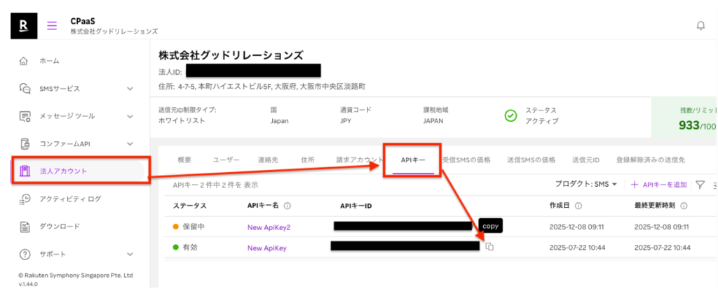 SMS用のAPIキーをコピーして、下の入力欄に貼り付けてください。