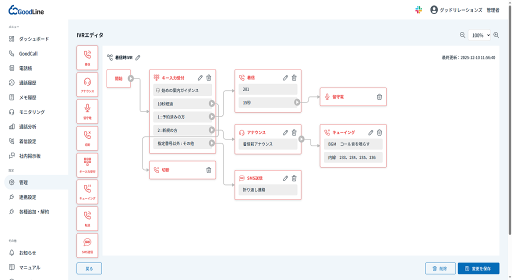 ・外線(電話番号)ごとに着信時のアクションを設定できます。・転送やアナウンス、留守電のアクションを日時で設定可能です。